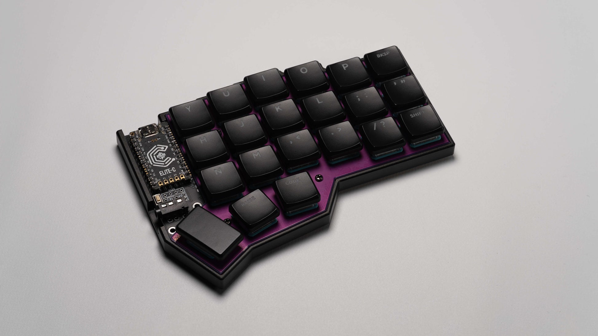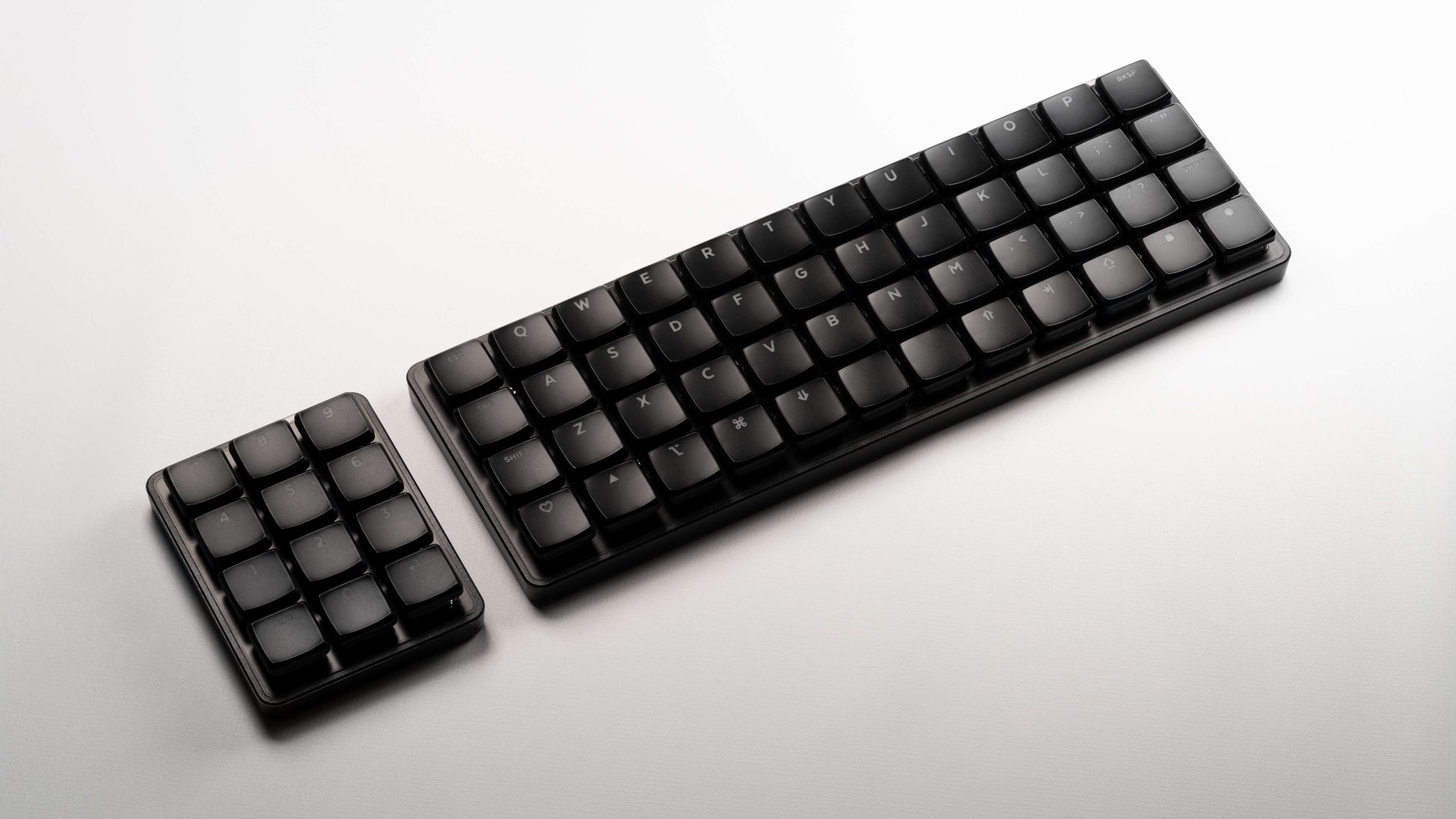Material is ABS (the most common option for shinethrough keycaps) and legends are laser etched, based on MBK Legend‡ design, carefully adapted to shine uniformly using the small LED window in Kailh Choc switches.